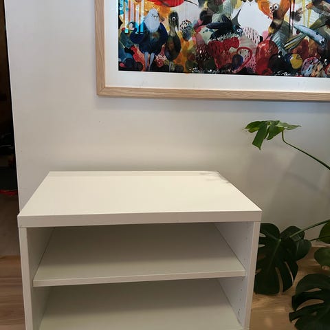 2 stk hyller, svart ramme, lys brun hylleplater. Mål er per hylle. Vi hadde dem ved siden av hverandre som vist i bilde. Selges samlet.