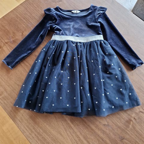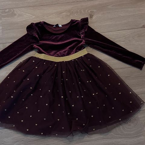 Pent brukt kjole i velour frs Cubus. To lag med tyll i skjørtet og så underskjørt/kjole. Søte hjerter i gullfarge på skjørtdel og belte i gullfarge.