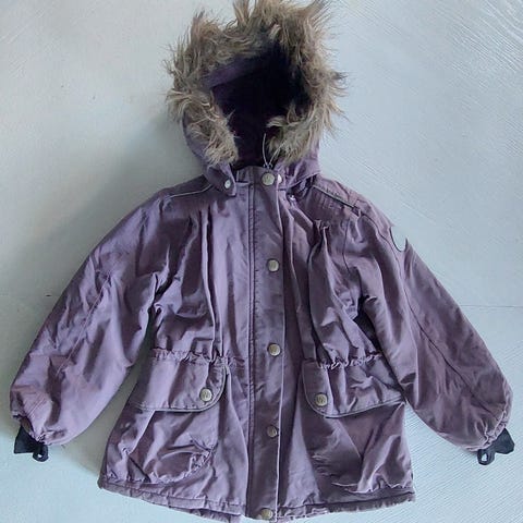 Wheat Vinterjakke i størrelse 110. Jakken er blå. Den har hette og praktiske lommer, egnet for utendørs bruk. Brukes kun av ett barn.
