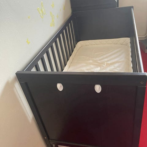Den ene siden på sprinkelsengen kan tas av når barnet er stort nok til å klatre inn/ut av sengen.