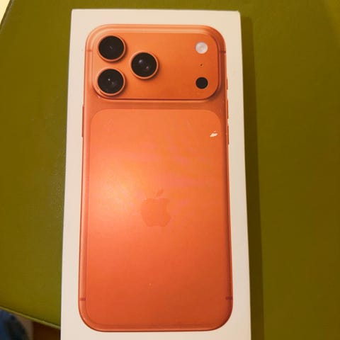 Apple iPhone 17 Pro mobiltelefon med 256 GB lagringskapasitet. Telefonen har en oransje farge og leveres i original emballasje.