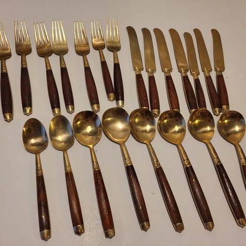 6 kniver, 6 skjeer, 5 gaffler og 1 serveringsskje