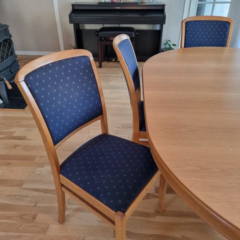 Moderne spisebord og stoler svært pent brukt i ca. 4 år. Spisebord i oljet eik, med en 4 cm tykk bordplate med fint og naturlig treverk. Med tilhørende klaff kan bordet fint ta minst 8 gjester. Sorte ben i metall gir bordet et god stabilitet. Fra serien "Narvik" fra A-Møbler. 6 Spise-stoler fra Skeidar i serien "Town" i sort-beiset og lakkert ask og tekstil i grått. Møblene er svært pent behandlet. Nypris kr. 29.400,-.
