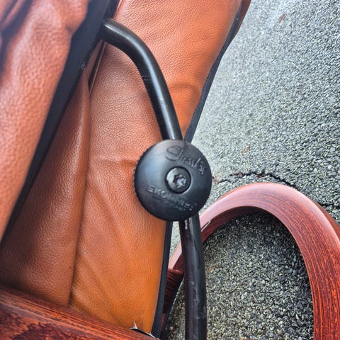 Lenestolen er brukt og har synlige bruksspor, men er fullt funksjonell. Mekanismer fungerer som de skal, og stolen er stabil.