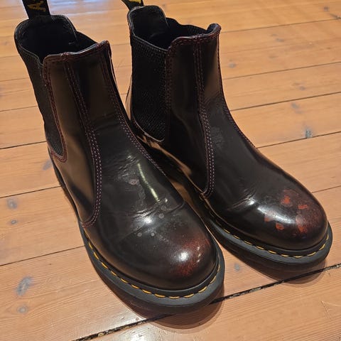 Dr. Martens støvler i størrelse 39 med gul farge. Laget av slitesterkt materiale, designet for daglig bruk. Pent brukt. Trenger nye skolisser