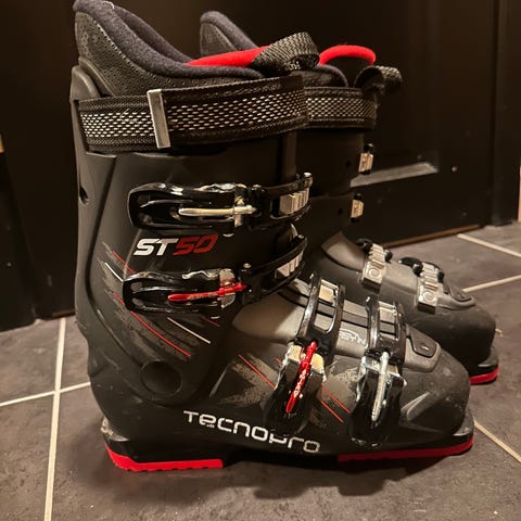 Tecnopro 60 alpinstøvler i svart og rød farge. Størrelse 44 (EU), 28.0 cm. Støvlene har fire spenner for god tilpasning og støtte ved alpint bruk.