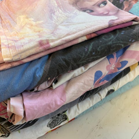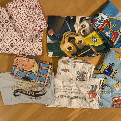 Tre sett med sengetøy, et med kaptein Sabeltann, et med brannmann sam og et grønt med dyreansikter. Det grønne er flanell, de to andre er bomull. Selges samlet til 200kr.