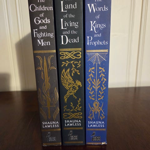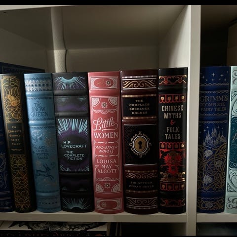Bøkene har kun stått til pynt og fremstår som ny. Med unntak The sonnets and a lovers complaint som har to små flekker (se bildet) kan sikkert skrapes/vaskes bort da omslaget er tøyaktig.