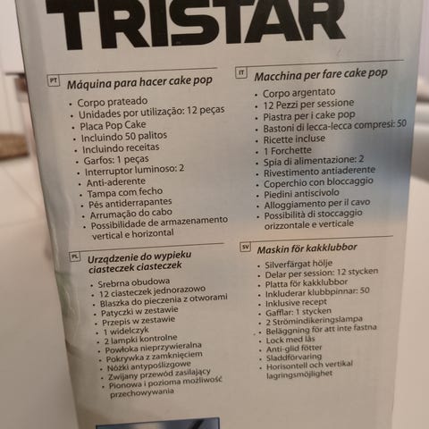 Tristar Cake Pop Maker for baking kakepops. En elektrisk kjøkkenmaskin med non-stick belegg for enkel rengjøring. Passer til hjemmebruk for å lage små kakebiter med rund form. Aldri brukt.