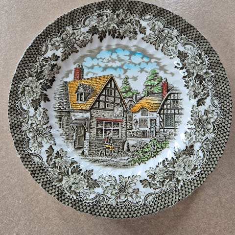 Veldig gammelt servise fra Crown Devon, England. En kopp med skade, hakk. 2 asjetter mangler kopp.