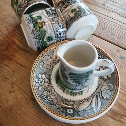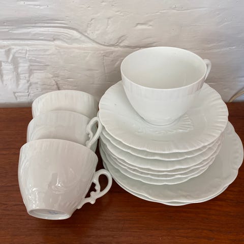 kaffeservise 6 asjetter, 4 kopper og en fløtemugge.