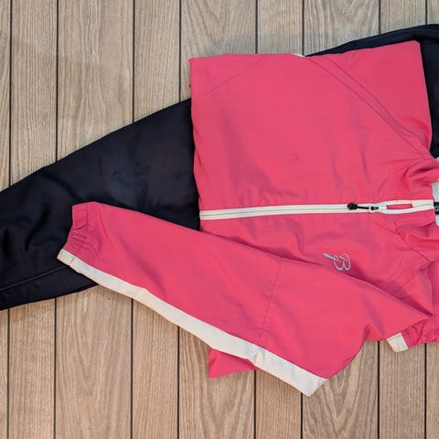 Helt og fint. Ingen skader eller merker. Brukt en uke på leirskole. Svarte bukser og oransje jakke. Str S - tilsvarer str 170.