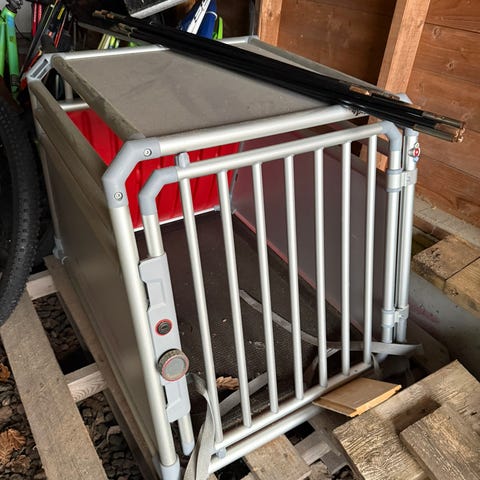 Hundebur i metall med sort plastbunn. Buret har doble dører og er sammenleggbart for enkel oppbevaring og transport. Passer for hunder som trenger et trygt og avgrenset område.