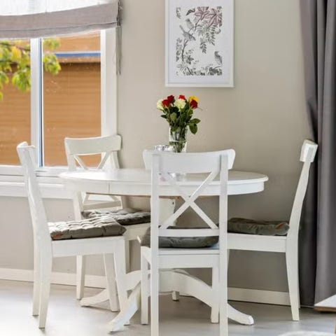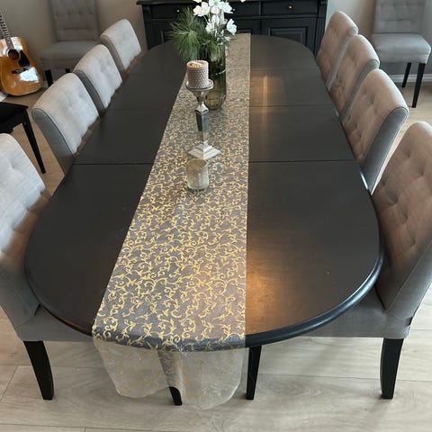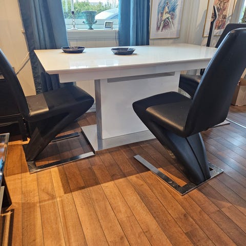 Spisestue med 8 stoler, også varetrekk til stolene følger med, stolene er kjøpt på,Jysk for 3 år siden og er like pene.