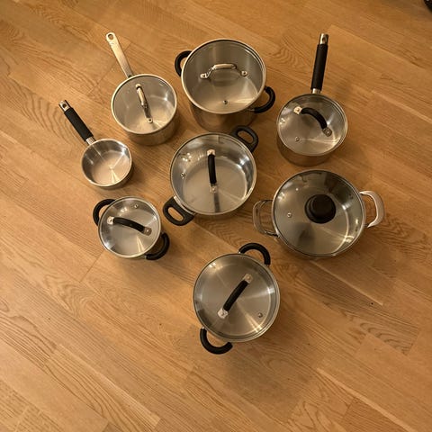 Stelton grytesett i rustfritt stål bestående av flere kjeler med lokk og en dampinnsats. Settet inkluderer kjeler med håndtak og en silinnsats for damping. Materialet er rustfritt stål, egnet for matlaging på komfyr.