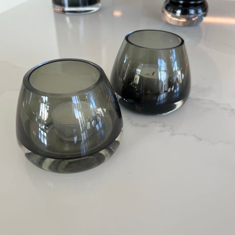 Holmegaard lyslykt laget av glass. Lyslykten har en rund form og er designet for å holde telys. Den har en grå fargetone og en enkel, funksjonell design som passer til ulike interiørstiler.