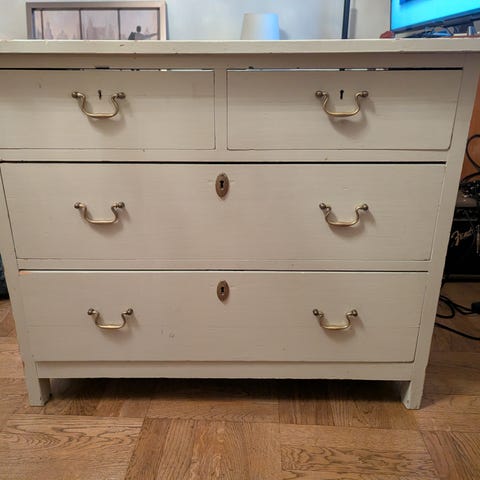 Eldre kommode i tre, alt funker som det skal og den er grei stand, litt merker på kantene og noen malingsflekker, men de kan sikkert skrapes bort, se siste bilde.