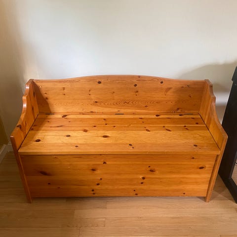 Malt, heltre benk med putesett og oppbevaringsrom selges billig.