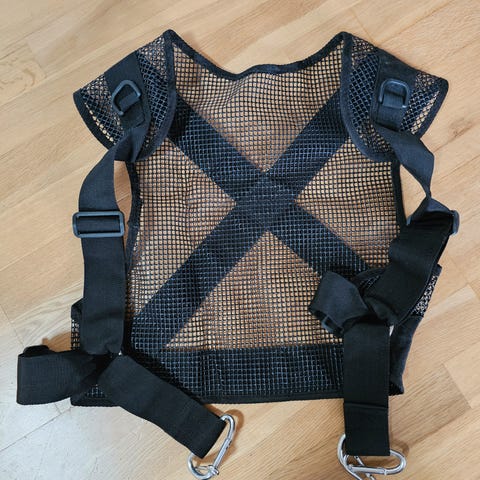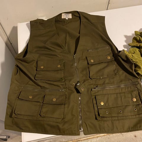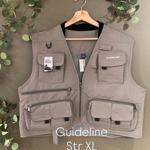 Fiskevest i blå og grå farge. Vesten har mange lommer og hette. Slitesterkt og funksjonelt ytterplagg.