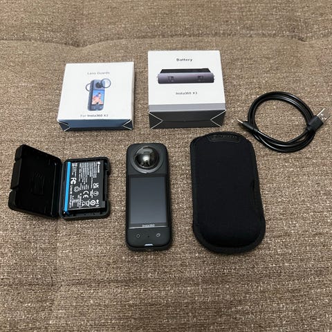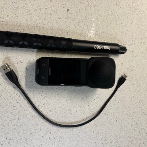 Insta360 camera X5 with a selfie stick. It has insta360 care until 2026.5, with 2 low cost replacement left.