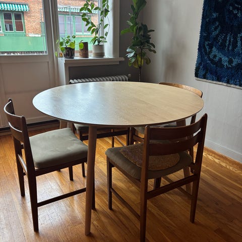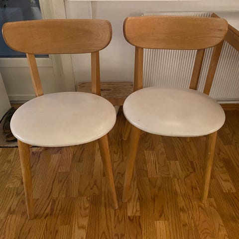 Rundt bord Ø110 i eik og to stoler selges samlet(Reservert)