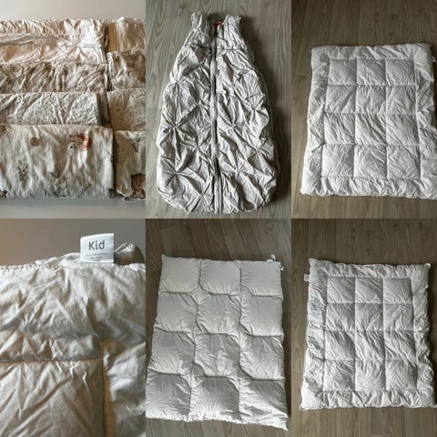 2 stk dundyner til barn (80x100cm) + dunpute (35x40cm) og div sengetøy