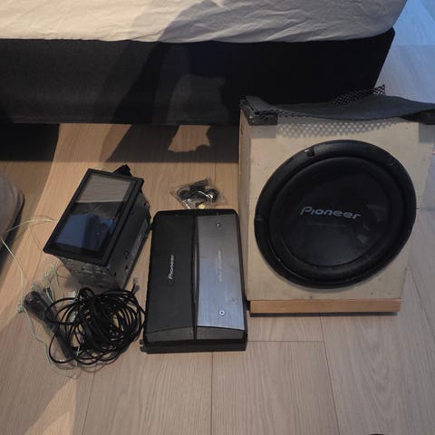 Pioneer DMH-A240DAB bilstereo med skjerm og tilkoblingskabler. Enhet for bruk i bil med funksjoner for lydavspilling og digital radio.
