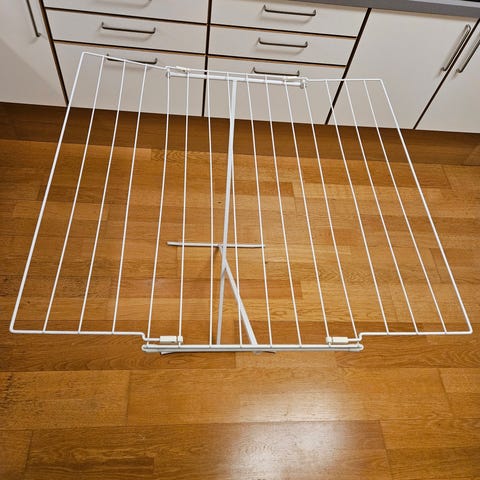 Utrolig praktisk tørkestativ som kan foldes på ulike måter utfra hvor mye eller lite du skal tørke .