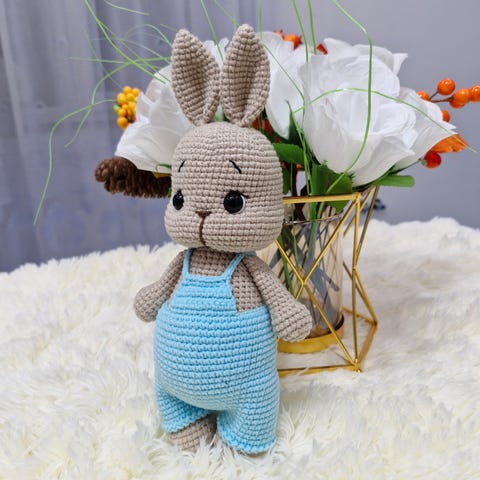 Hjemmesydd kanin dukke med kjole og sløyfe som kan tas av. Andre klær kan syes på bestilling.