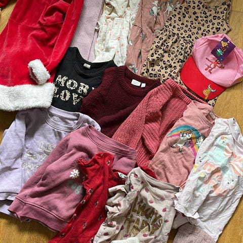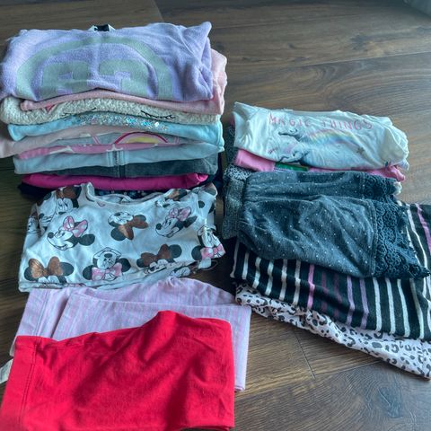 Klespakke til jente, str 98-104. Inneholder 14 kjoler, 6 tskjorter /topper, 6 bukser /tights, 2 strømpebukser i tynn ull, 3 shorts, 3 luer, 7 overdeler med knepping, 9 hele overdeler.