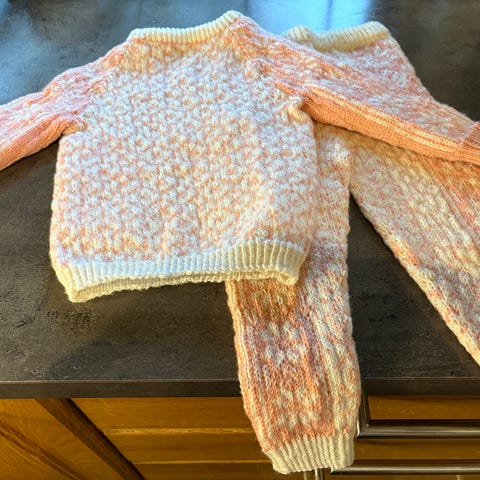 Nydelig hjemmestrikket sett med genser og bukse, mønsteret heter Ellinor. Strikket med merinoull. Ca str 92, se bilder for mål.