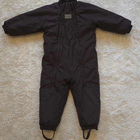 Ingen hull, men litt slitasje på begge knær og rundt armåpningene. Ingenting å si for bruken.