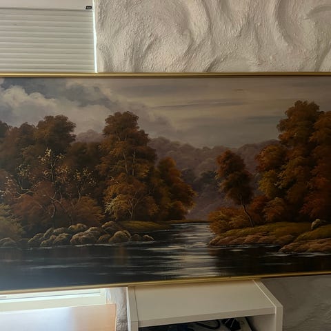 Maleri med fossefall og skogsmotiv