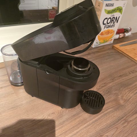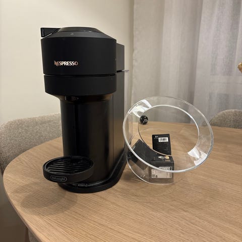 Nespresso Vertuo Next kapselkaffemaskin i svart og hvit farge. Maskinen bruker Nespresso-kapsler og har et kompakt design som passer for hjemmebruk. Den har et vannreservoar på baksiden og en avtakbar dryppskål. Maskinen er beregnet på å lage enkeltkopper med kaffe ved bruk av kapsler.