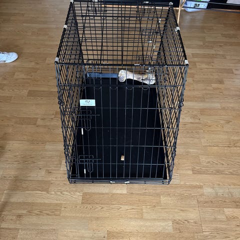 Metallbur i svart farge, egnet for bruk til kjæledyr. Burkonstruksjonen består av metallnett med en dør og et lokk som kan åpnes. Buret er designet for å gi et sikkert og ventilert opphold for kjæledyr.
