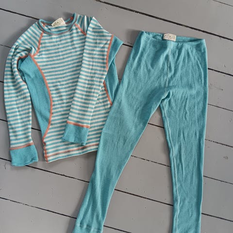 Deilig ulltøy fra Nøstebarn. Bukse i ullfrotté. Knærne forsterket med ekstra ull pga begynnende rift. Str 128, men oppleves som liten i str. Nypris er ca 1150 for settet.