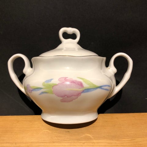 Dette polske porselensmerket har produsert servise siden 1890-tallet og er kjent for sin kvalitet. Det spesifikke settet på bildet har et elegant design med rosa roser og grønne blader, og gullkonturer rundt kantene.