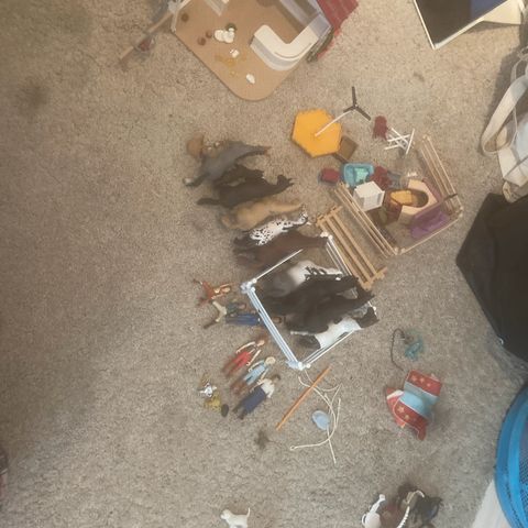Schelich stall med masse hester / figurer. Ekstra utstyr , liten stall + overbygg om man vil lage ridebane. Pent brukt.