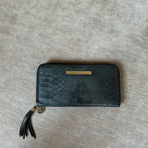 Liten clutch/lommebok. Har en reim og glidelåslukking.