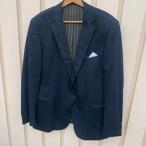 Dressjakka er lite og pent brukt. To lommer foran, to splitter bak. Lengde fra skuldra og ned 75 cm, ytre ermlengde 63 cm. Fin detalj med påsydd albuebeskytter i samme stoff.