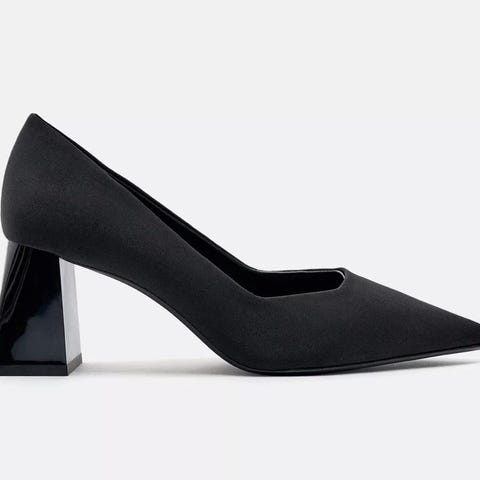 Zara hæler i størrelse 35. Skoene har en tofarget design med hvit front og korallfarget ankelrem. Hælene er dekorert med et mønster i flere farger. Passer til formelle og uformelle anledninger.