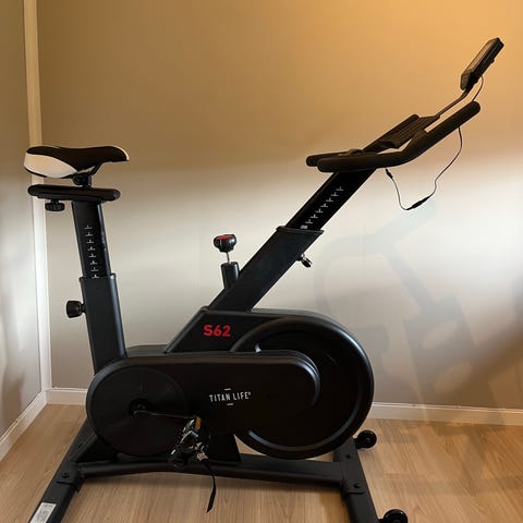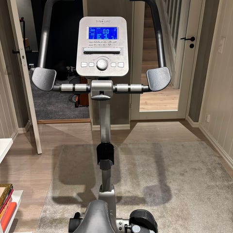 Titan Life treningssykkel med digital skjerm for måling av tid, hastighet, distanse, kalorier og puls. Utstyrt med justerbart sete og håndtak for komfort under trening. Meget pent brukt.