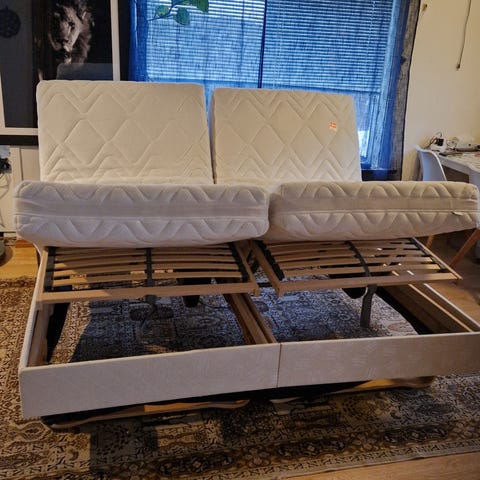Selger 2 stk 90x200 SKOTTERUD rammemadrasser fra IKEA pluss BRYNILEN bein, med SULTAN festebeslag, så den kan brukes som dobbeltseng. Kjøpt for ca 1,5 år siden. Selges helst samlet:)