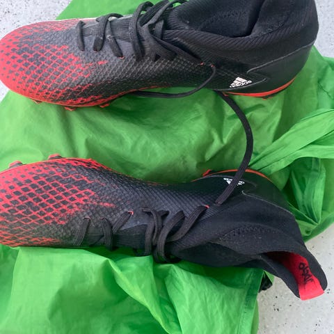 Adidas Predator hvit med grønne knotter, størrelse 42 1/2. Skoene er designet for bruk på kunstgress eller harde underlag, som grus. Spilt med 2 kamper av sønn, før han vokste ut av dem. Ser omtrent helt nye ut.