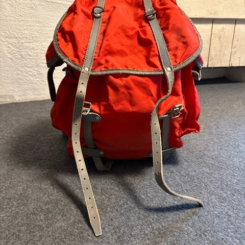Gammel tursekk av grått lerretsstoff med reimer av skinn. Luktfri og i god stand for turbruk. Kan sendes, evt. hentes på Byåsen.