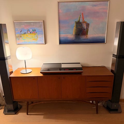 Klassiske aktive vegghøytalere/paneler med innebygget forsterkere. Alle elementer er i perfekt stand og begge display virker. Høyttalerene spiller som de skal. Noen merker etter 30 år men ser ikke så galt ut kosmetisk. Dette er siste versjon med grønt display. Strømkabler er forlenget til ca 2,5 meter.