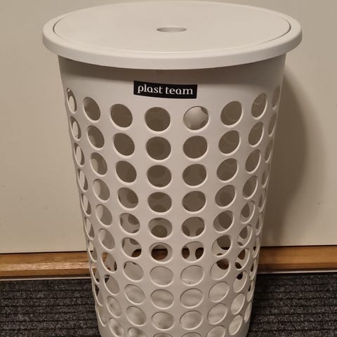 Sort plast skittentøykorg med hullmønster. Lett og enkel å rengjøre.