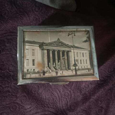 Selger denne tre esken kledd med metallplater på tre sider. To rom til magasiner, noter eller andre ting.