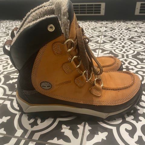 Timberland vinterstøvler i størrelse 39, 5. Støvlene er designet for bruk i kalde forhold med solid såle for godt grep. Fargen er grønn med svarte detaljer rundt ankelen. Materialet er slitesterkt og egnet for vinterbruk.