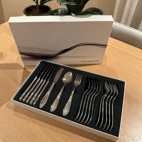 Hardangerbestikk Nina. Ligger i en eske merket med isskjeer, men er altså gafler. Kan sendes mot porto